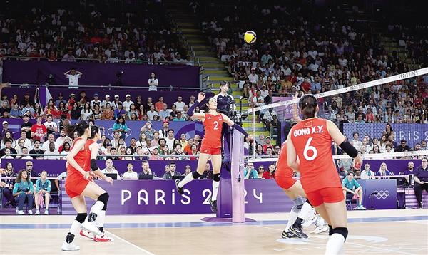 7月29日,中国队球员朱婷(上)在比赛中。 当日,在巴黎奥运会排球女子小组赛A组比赛中,中国队3比2战胜美国队。 新华社记者 赖向东 摄