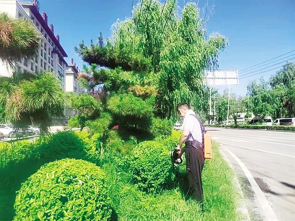 连日来,县城市绿地建设中心抓住雨后有利时机,按照相关要求,迅速开展苗木修剪、除草、病虫害防治等保绿护绿工作,确保城区绿化景观整洁、亮丽。图为该中心工作人员对绿化苗木进行修剪。 记者 侯国防 通讯员 完颜纪伟 摄