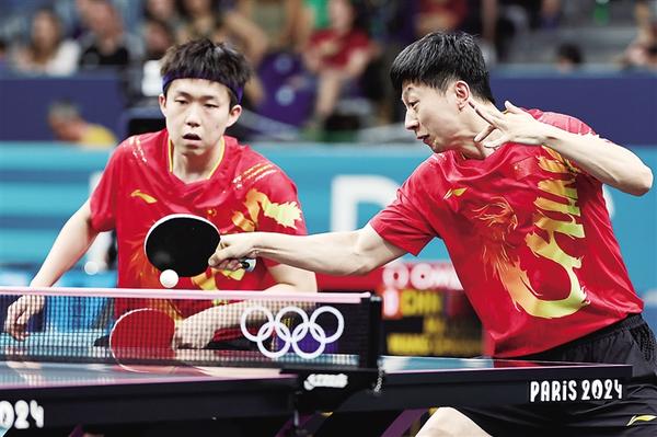 ▲8月6日,中国队选手马龙(右)/王楚钦在比赛中。他们3比0战胜印度队选手德塞/塔卡。当日,在巴黎奥运会乒乓球男团16强赛的比赛中,中国队3比0战胜印度队,晋级八强。 新华社记者 王东震 摄