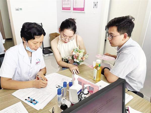 8月10日,正值七夕节,不少新人选择在这天登记结婚,携手共度一生。当日,川汇区妇幼保健院协调科室人员,优化服务流程,加强引导分流,确保每一对新人都能顺利、便捷、安全地享受到优质免费婚检服务。图为工作人员正在为新人做婚检登记。 刘伟 摄
