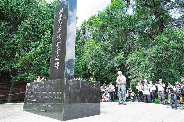 8月13日,侵华日军第七三一部队“少年队”原队员清水英男在侵华日军第七三一部队旧址“谢罪与不战和平之碑”前忏悔谢罪。