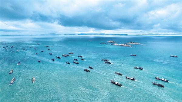 8月16日,在福建省福州市连江县黄岐国家中心渔港,渔船开渔出海(无人机照片)。