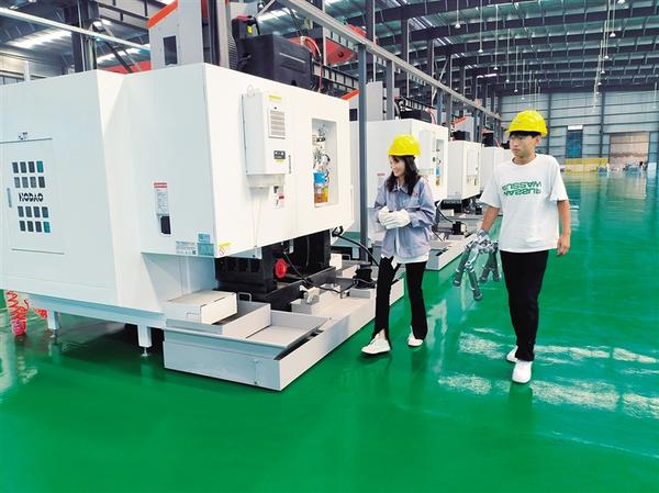 日前,两名工人在扶沟县中原汽车零部件产业园嘉友机械制造项目智能化车间巡查。嘉友机械智能化车间建成投入使用以来,生产效率提高15%以上,产品不良率降至0.8%,综合效益提升21%。记者 沈湛 摄