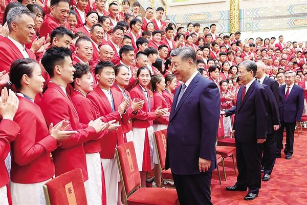 在热烈的掌声中,习近平发表重要讲话。他表示,中国体育代表团的优异成绩,既是我国体育事业发展进步的集中体现,也是中国式现代化建设成就的一个缩影,充分彰显了新时代中国力量。国运兴则体育兴、国家强则体育强。我国能够跻身世界体育大国、奥运强国之列,根本在于综合国力不断增强,为体育竞技训练提供了先进科技支撑和坚实物质保障,也为各领域体育人才脱颖而出创造了良好成长环境和广泛群众基础。新时代新征程,以中国式现代化全面推进强国建设、民族复兴伟业,必将为我国体育事业发展提供更好条件、注入强劲动力。我们要继续大力发展以人民为中心的体育事业,推动全民健身和全民健康深度融合,向着建设体育强国、健康中国的目标不断迈进。