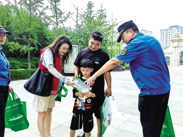 文昌街道志愿者和示范区综合执法中心工作人员向群众宣传生活垃圾分类知识。