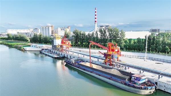 位于周口临港开发区的益海(周口)粮油工业有限公司码头采用粮食输送管廊将码头作业区与后方益海嘉里厂区直接相连,形成“前港后厂”无缝衔接的粮食转运储备及加工体系,实现粮食来港直卸、卸船直检、高效入仓,将为企业大幅节约粮食转运成本、提高粮食运输效率、减轻库存压力。图为一艘停靠在益海(周口)粮油工业有限公司码头的粮食运输船正通过自动化机械将粮食运往益海嘉里厂区。 记者 宋风 摄