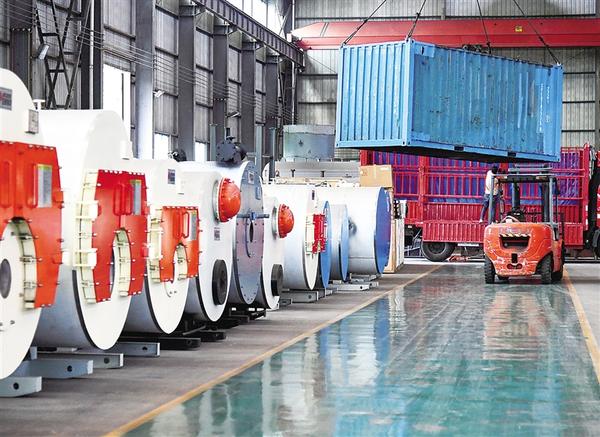 8月21日,太康县四通锅炉有限公司车间内,工人正在装卸设备。太康县作为我国知名的“锅炉之乡”,目前有锅炉生产企业56家,年生产能力达6万蒸吨,国内市场占有率为35%,在我国形成了A级锅炉企业比较集中的生产基地,产品已出口到110多个国家和地区。 记者 沈湛 摄