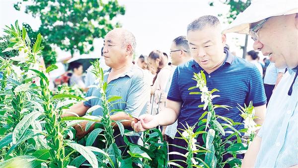 8月16日,由河南省农业科学院芝麻研究中心、周口市农业科学院共同组织的宜机收芝麻新品种及机械化生产技术推广应用现场观摩会在项城市举行。图为来自全国各地的芝麻学者、企业代表、种植大户在丁集镇一处芝麻种植地观摩。 记者 张志新 摄