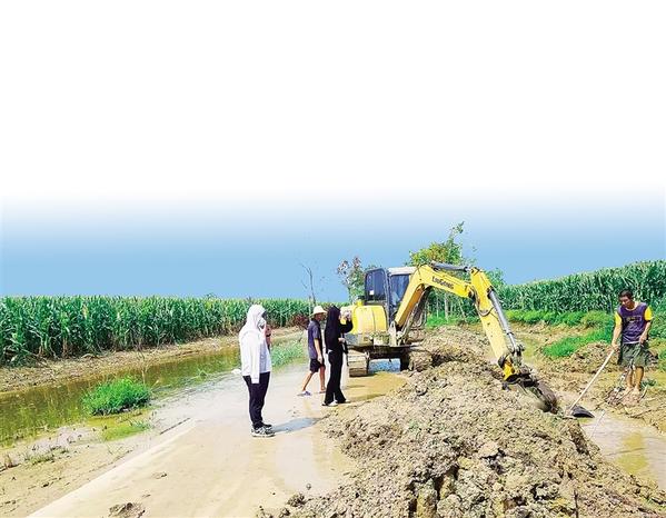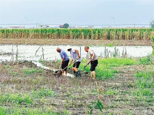 8月26日下午,郸城县吴台镇张楼行政村包村干部徐书磊、村党支部书记尚艳明、村干部张岭先带领群众在田间挖沟排水,把积水引入闫家沟,力保秋粮生产安全。徐书磊告诉记者:“现在大部分地块没水了,只有个别低洼处存在积水,但现在沟满河平,机井水位也很高,出现排水难题。我们只能拉长战线,打通竹节沟,把田间积水排入远一点的河沟中。”