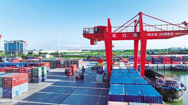 今年以来,周口港中心港区智慧港口建设全面加速,智能闸口、智能理货、智能堆场等即将投入使用,新入驻的11家临港贸易企业经营状况良好。图为繁忙的周口港中心港区。