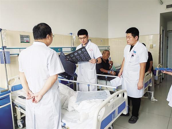 为满足广大患者的就医需求,8月23日,周口市人民医院特邀中国人民解放军总医院神经外科专家到院开展活动,让患者在“家门口”就能享受到知名专家的诊疗服务。图为专家(左二)在病房查看患者检查影像。