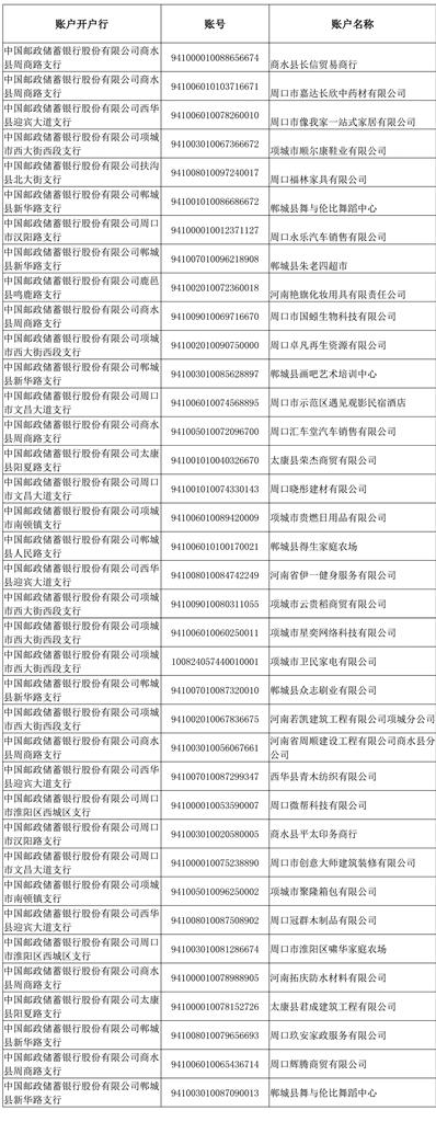 贵单位在中国邮政储蓄银行周口市分行开立的单位银行结算账户,因单位证照已是注销状态,需在本公告发布之日起30日内来我行开户网点办理账户撤销手续。逾期未办理的,我行将根据中国人民银行《人民币银行结算账户管理办法》《关于印发<河南省注销企业人民币银行结算账户退出管理办法(试行)>的通知》以及账户管理协议约定,采取自动销户措施,敬请谅解。