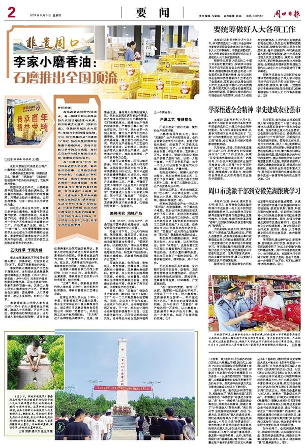 川汇区人李永生年少时,跟着父亲学做小磨香油,推着车到周边集市贩卖。石磨悠悠转动,车轮轧破了时光,李家的小油坊如今发展为一个年产万吨香油及芝麻酱的大工厂,产品卖遍了全国,踏上了“一带一路”。当年懵懵懂懂的卖油郎李永生也成长为成熟稳健的企业家,李家传统石磨香油生产工艺已荣升市级非遗,这项古老的技艺正在焕发前所未有的光彩。