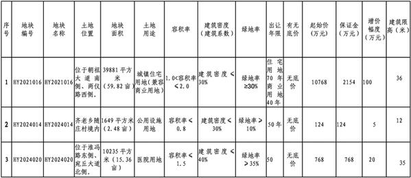 3.HY2024020号地块为医院用地,具体建设方案须报规划部门批准后实施。土地出让合同签订后,土地成交价款需在60日内缴清,交地时间18个月内,交地后6个月内必须开工建设,工期35个月。