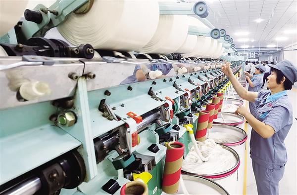 商水县再生纤维产业园区项目由该县达纺纤维科技有限公司投资建设,总投资1.2亿元,可年产再生纤维1.5万吨、纱线1.8万吨。项目达产后,可实现年产值2.5亿元、利税约1200万元,提供300个就业岗位。图为园区纺织车间的工人们正在生产作业。记者 王映 摄