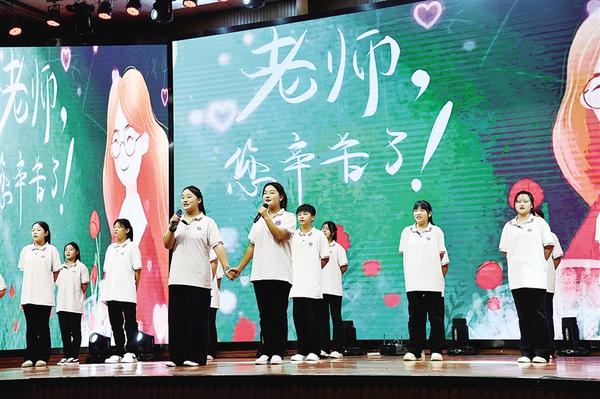 9月9日晚,周口技师学院幼教学院学生将自编自导自演的话剧、歌舞、诗歌朗诵、器乐展示等节目搬上舞台,庆祝第四十个教师节,向辛勤培养自己的老师表达崇敬、感恩之情,同时也向刚入校的新生展示自己的学习成果。