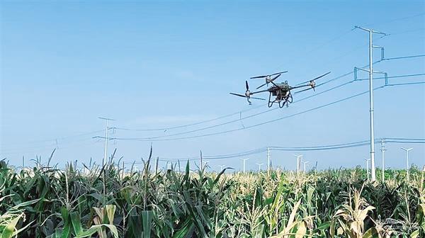 9月1日上午,在城北街道的田间地头,农技人员操作无人机对玉米、大豆等作物喷施杀虫剂、植物生长调节剂、叶面肥,实现一次喷施促植株稳生长、促病虫害防治、促单产提升等多重功效。