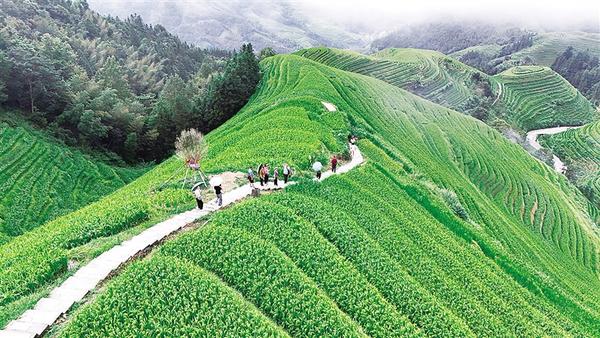 一场秋雨过后,广西龙胜各族自治县龙脊梯田云雾缭绕,云海、梯田、吊脚楼构成一幅幅美丽的田园画卷。