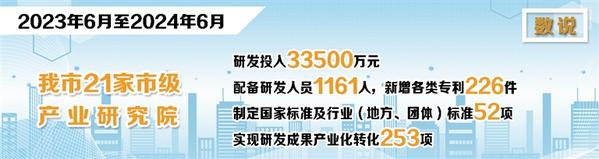 据市工信局和市财政局对我市21家首批及第二批市级产业研究院年度考核评价统计,2023年6月至2024年6月,21家市级产业研究院研发投入33500万元,配备研发人员1161人,新增各类专利226件,制定国家标准及行业(地方、团体)标准52项,实现研发成果产业化转化253项,整体梯次培育初具规模,形成支撑引领我市产业创新发展的重要力量。