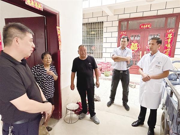 9月5日,淮阳区王店街道袁庄村村医夏守伸(右一)来到村民家中走访,对脱贫户、慢性病患者、行动不便的老年人等群体进行健康监测。