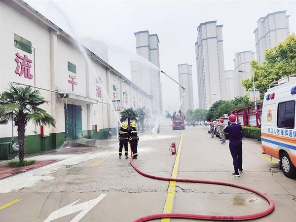 9月13日,市应急管理局组织相关单位工作人员在某粮库开展大比武大练兵综合演练。图为应急救援人员在演练中向模拟起火点喷水。