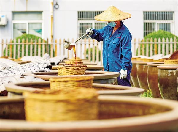 9月21日,滕州市鼎盛酿造有限公司的工人在晾晒场上浇淋晒制酱油。 近年来,山东省滕州市依托当地农业产业优势,全力做好农产品深加工文章,促进农民增收,助力乡村振兴。目前,该市拥有国家级农业龙头企业3家,省级农业龙头企业14家,市级农业龙头企业98家,涉及粮食、果蔬、畜禽水产等多个品类。 新华社发(张进刚 摄)