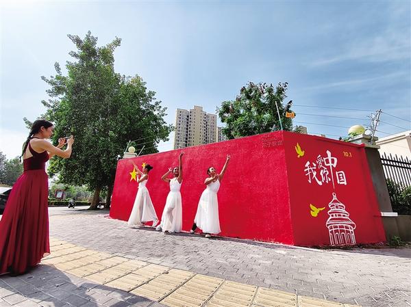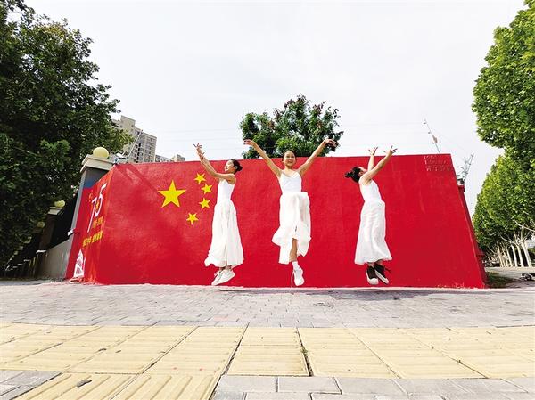 9月26日上午,在周口中心城区黄河路与汉阳路交叉口东南角的国庆主题彩绘墙前,三位年轻人翩翩起舞。