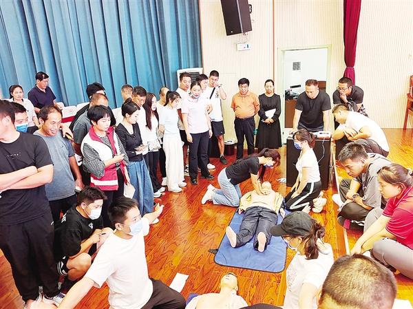 本报讯(记者 侯俊豫 通讯员 薛锋 文/图) 9月20日,区红十字会和区教体局联合开展急救知识培训进校园行动,向中小学师生普及急救知识和技能,增强他们的自救互救能力,提高他们对突发事件的应急处置水平,保障师生生命安全和身体健康。区红十字会志愿者、380余名中小学体育教师参加培训。