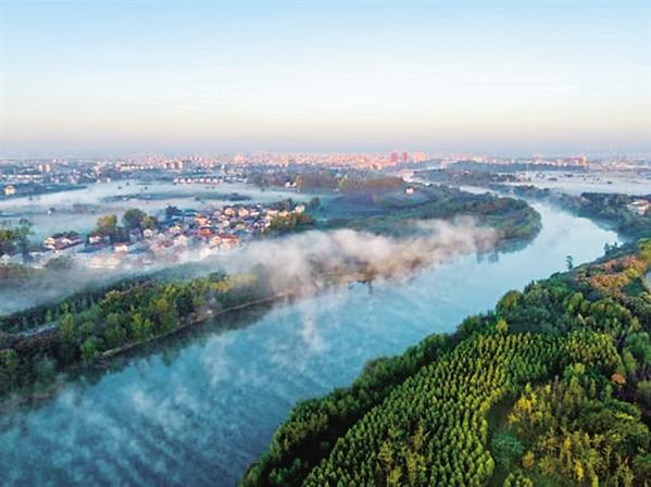 金秋时节,俯瞰鹿邑县涡河省级湿地公园,一河两岸树叶泛黄,河内流水潺潺,优美的环境让人心旷神怡。记者 侯国防 通讯员 厉佳 摄