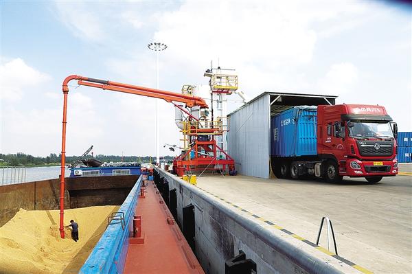 10月15日,周口港中心港作业区正在通过自动吸粮机进行大豆卸船作业。据了解,周口港中心港作业区目前已安装自动吸粮机3台,卸船效率分别达到100吨/小时、200吨/小时、300吨/小时,大幅提高码头作业效率,提升港口的智能化和数字化水平。