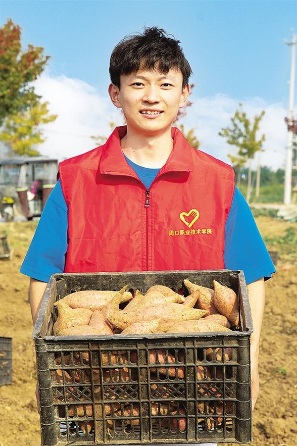 10月15日,商水县黄寨镇草楼行政村蜜薯产业园内,50多名周口职业技术学院经济管理学院网络营销与直播专业的大学生在田间直播带货。他们站在手机镜头前,不停地与网友热情互动,并用亲身体验推介蜜薯。该院把课堂搬到田间地头,让枯燥的理论课变成直播带货的实训课。记者 刘华志 摄