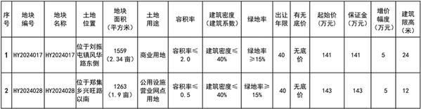拍卖报价时间:2024年11月14日9时(HY2024017地块)。2024年11月14日9时10分(HY2024028地块)。