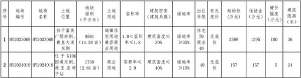 拍卖报价时间:2024年11月21日9时(HY2023069地块);2024年11月21日9时10分(HY2024019地块)。