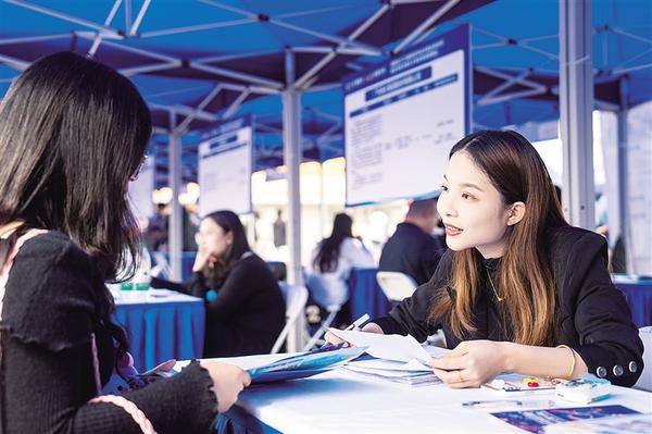 10月29日,在长沙学院天健体育场,企业招聘人员(右)向求职学生介绍岗位信息。