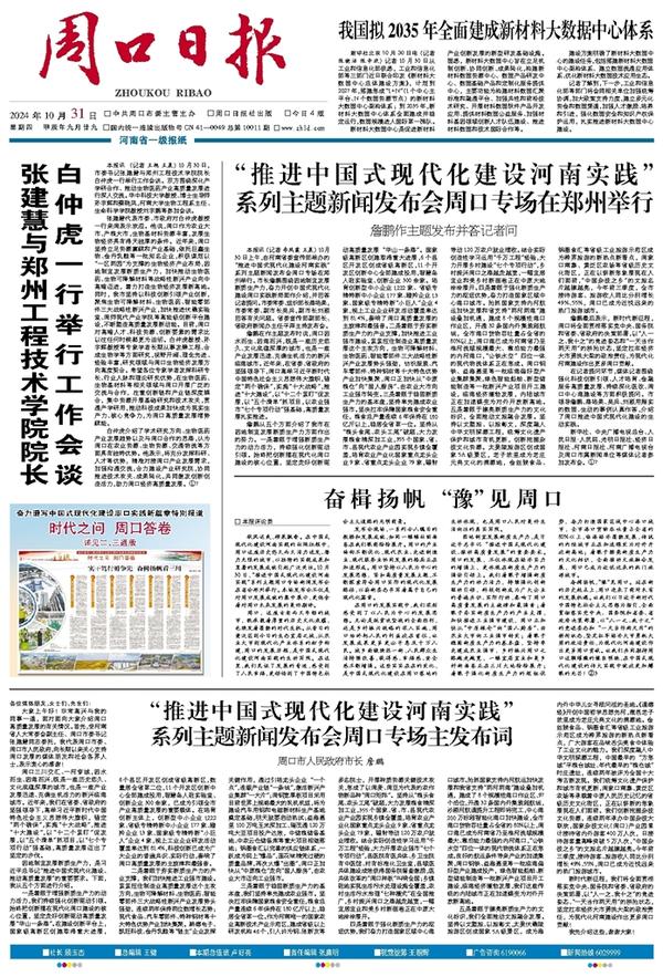 本报讯 (记者 李凤霞 王晨) 10月30日上午,由河南省委宣传部举办的“推进中国式现代化建设河南实践”系列主题新闻发布会周口专场在郑州举行。市长詹鹏围绕因地制宜发展新质生产力,奋力开创中国式现代化建设周口实践新局面作介绍,并回答记者提问。市委常委、组织部长路培果,市委常委、副市长吴兵,副市长刘颖回答有关问题。省委宣传部副部长、省政府新闻办主任平萍主持发布会。