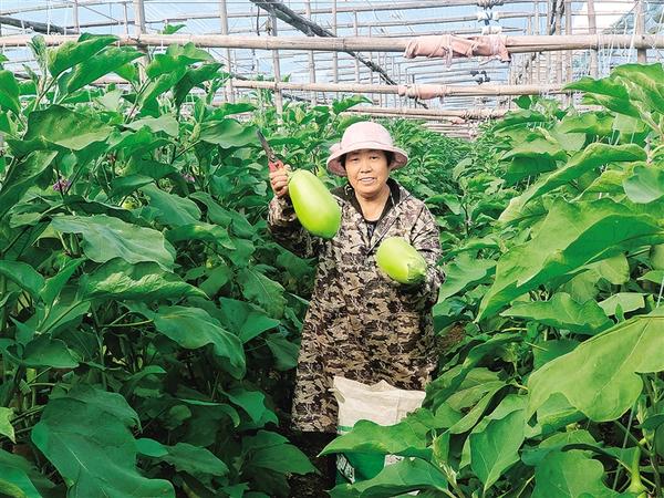 近年来,扶沟县大力发展蔬菜产业,走科技创新引领发展之路,把“小菜篮”做成了县域特色品牌、群众致富的“金饭碗”。图为11月2日,在扶沟县曹里乡西吴行政村的蔬菜大棚里,菜农正在采摘青茄。