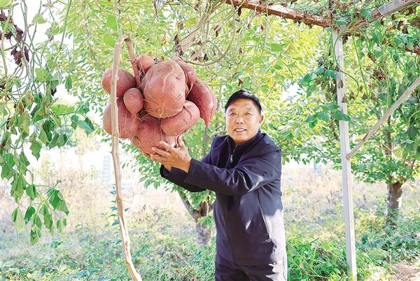 11月5日,在郸城县新天豫薯业公司,红薯种植研究员贾连东培育出的“空中红薯”像一排大红灯笼挂在支架上,个个长出了超大个头,单株重量突破63斤,单个红薯重量突破14斤。