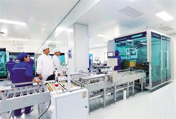位于郸城县的河南百年康鑫药业有限公司投资1.35亿元实施中药口服液制剂生产线智能化改造项目,改建中药口服液数字智能化车间。项目投产达效后,生产效率将提高3倍以上,可实现销售收入4亿元以上、利税5000万元以上,新增就业岗位40个。图为生产车间内,工人在全神贯注监控流水线生产。