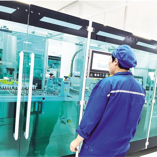 位于郸城县的河南百年康鑫药业有限公司投资1.35亿元实施中药口服液制剂生产线智能化改造项目,改建中药口服液数字智能化车间。项目投产达效后,生产效率将提高3倍以上,可实现销售收入4亿元以上、利税5000万元以上,新增就业岗位40个。图为生产车间内,工人在全神贯注监控流水线生产。