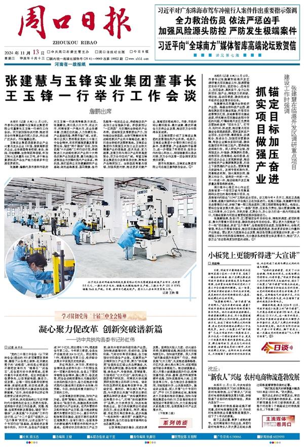 张建慧、詹鹏代表市委和市政府对王玉锋一行来周考察表示欢迎。张建慧说,周口是人口大市、农业大市、河南省第一产粮大市,农业资源丰富、交通区位优越、人力资源充裕、产业基础完备、消费市场广阔。当前,周口正深入贯彻落实党的二十届三中全会精神,牢牢把握高质量发展首要任务,锚定“两个确保”目标,加快实施“十大战略”三年行动计划,持续推进三大战略性新兴产业和十大特色优势产业加速发展,着力构建以先进制造业为支撑的现代产业体系。特别是,我们坚持立足资源禀赋和产业基础,依托益海嘉里、莲花健康、金丹乳酸等一批知名企业,持续推动农产品加工业全链条升级,积极谋划以“一区两园”为支撑的生物经济产业布局,因地制宜发展新质生产力,加快推动生物医药、生物可降解材料等战略性新兴产业向中高端迈进,着力打造生物经济发展新高地。玉锋实业集团作为我国玉米加工业及生物大健康产业的领跑者,技术先进、实力雄厚,发展方向与周口产业布局高度契合,双方合作空间广阔。希望玉锋实业集团充分发挥自身优势,聚焦农产品精深加工、生物医药等重点领域,加强深度对接,推动更多关键产业、高端项目落地周口。市委、市政府将以最好服务、最大诚意、最优环境全力支持企业发展,推动双方合作取得务实成果。