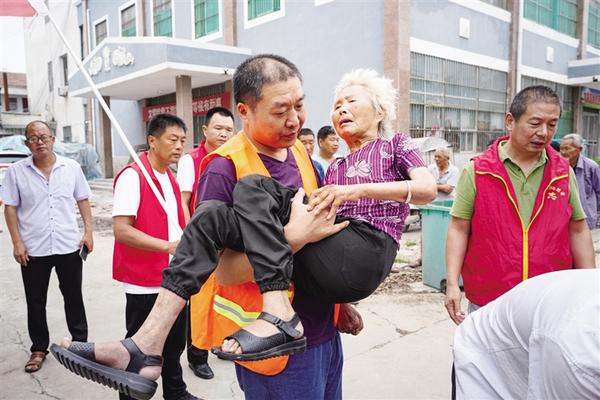 图1 扶沟县烟草专卖局(分公司)党员志愿者在防汛期间帮助行动不便的群众撤离。