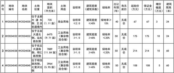 拍卖报价时间:2024年12月12日9时(HY2024030地块)。2024年12月12日9时10分(HY2024032地块)。2024年 12月12日9时20分(HY2024038地块)。2024年 12月12日9时30分(HY2024040地块)。