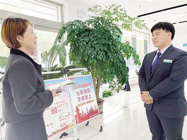 近期,农行周口分行开展消防安全活动,利用网点LED显示屏播放宣传标语,向前来办理业务的群众发放宣传折页,增强群众的消防安全意识。图为11月14日,该行工作人员向客户讲解消防安全的重要性。 王鹖鹏 王超 摄