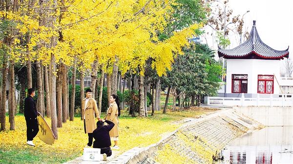 11月18日,一对情侣在淮阳蔡河北岸银杏林下拍写真。初冬时节,淮阳城区的大街小巷、街头游园风景如画,银杏、白蜡、法桐等树种的树叶色彩斑斓,美不胜收。
