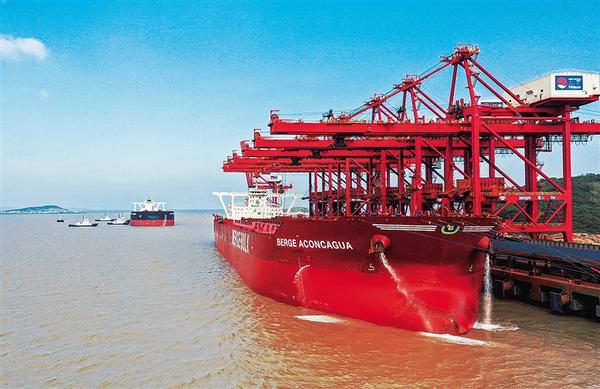 11月21日,两艘40万吨矿船靠泊宁波舟山港鼠浪湖矿石中转码头(无人机照片)。 当日,两艘来自世界重要铁矿石生产和出口商——巴西淡水河谷的40万吨矿船“阿空加瓜”轮和“矿石天津”轮,在浙江省舟山市岱山县的鼠浪湖矿石中转码头实现“同框”。这是全球首次两艘40万吨矿船同时靠泊在单体码头进行接卸作业,标志着宁波舟山港开创了全球港口运营的新篇章。鼠浪湖矿石中转码头是宁波舟山港铁矿石集疏运体系的重要组成部分,同时拥有两个40万吨泊位的单体码头。新华社发(张磊 摄)
