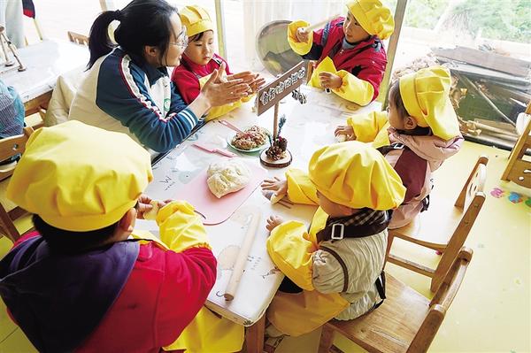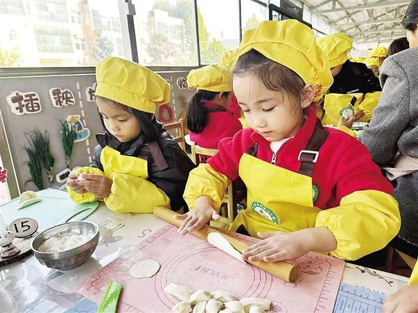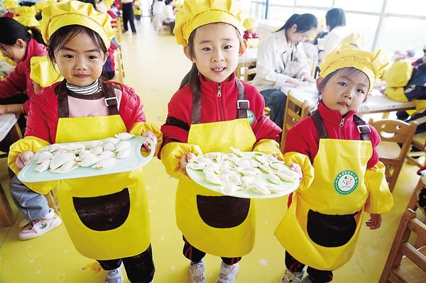 为锻炼孩子们的动手能力,近日,太康县实验幼儿园组织开展包饺子活动。在老师的带领下,孩子们和面、盘馅儿、擀皮儿、包饺子,干得有模有样。图一为孩子们展示包好的饺子。图二为老师教孩子们揉面。图三为孩子认真擀皮儿。