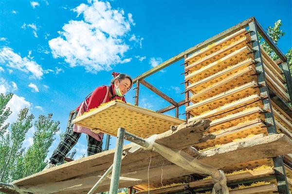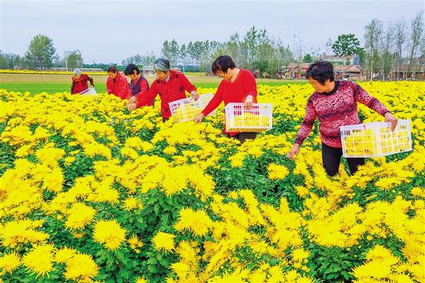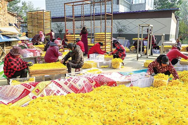 近年来,西华县清河驿乡腰庄村按照“一村一品”发展思路,因地制宜推广种植金丝皇菊,不仅为当地增添了一道亮丽的风景,也为村民带来了一条增收致富的新渠道。图为该村村民在收获金丝皇菊。