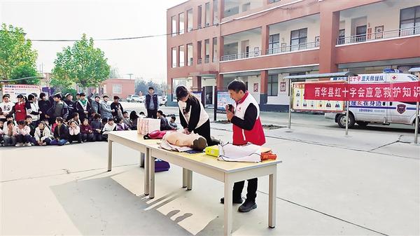 11月22日,西华县红十字会志愿者走进聂堆镇民族小学开展应急救护培训活动,进一步提高师生的自救互救能力。图为活动现场。记者 张猛 孙靖 通讯员 宋芹芹 摄