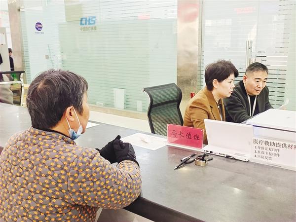 图为商水县医疗保障局局长卫春忙(中)在医保经办服务窗口开展“走流程、坐窗口、优服务”活动。
