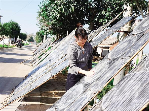 近年来,沈丘县付井镇发挥红薯种植资源优势,采用传统手工工艺和现代机器相结合的方法,大力发展纯红薯粉皮加工产业,将资源优势转化为经济效益,引领群众依靠特色产业增收致富。图为12月1日,付井镇杨庄村村民忙着加工、晾晒粉皮。